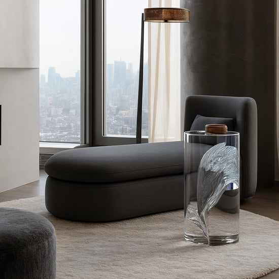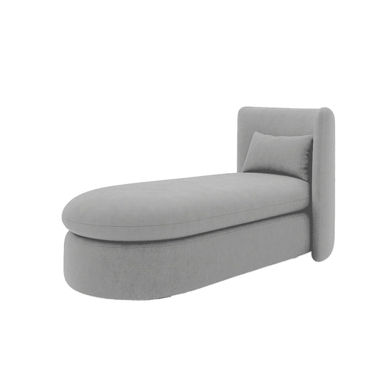 The Evita Chaise Sofa combines upright support with a restful design, featuring a stylish curved back. Its curved seating offers comfort and the luxurious materials add a touch of elegance to any living space.