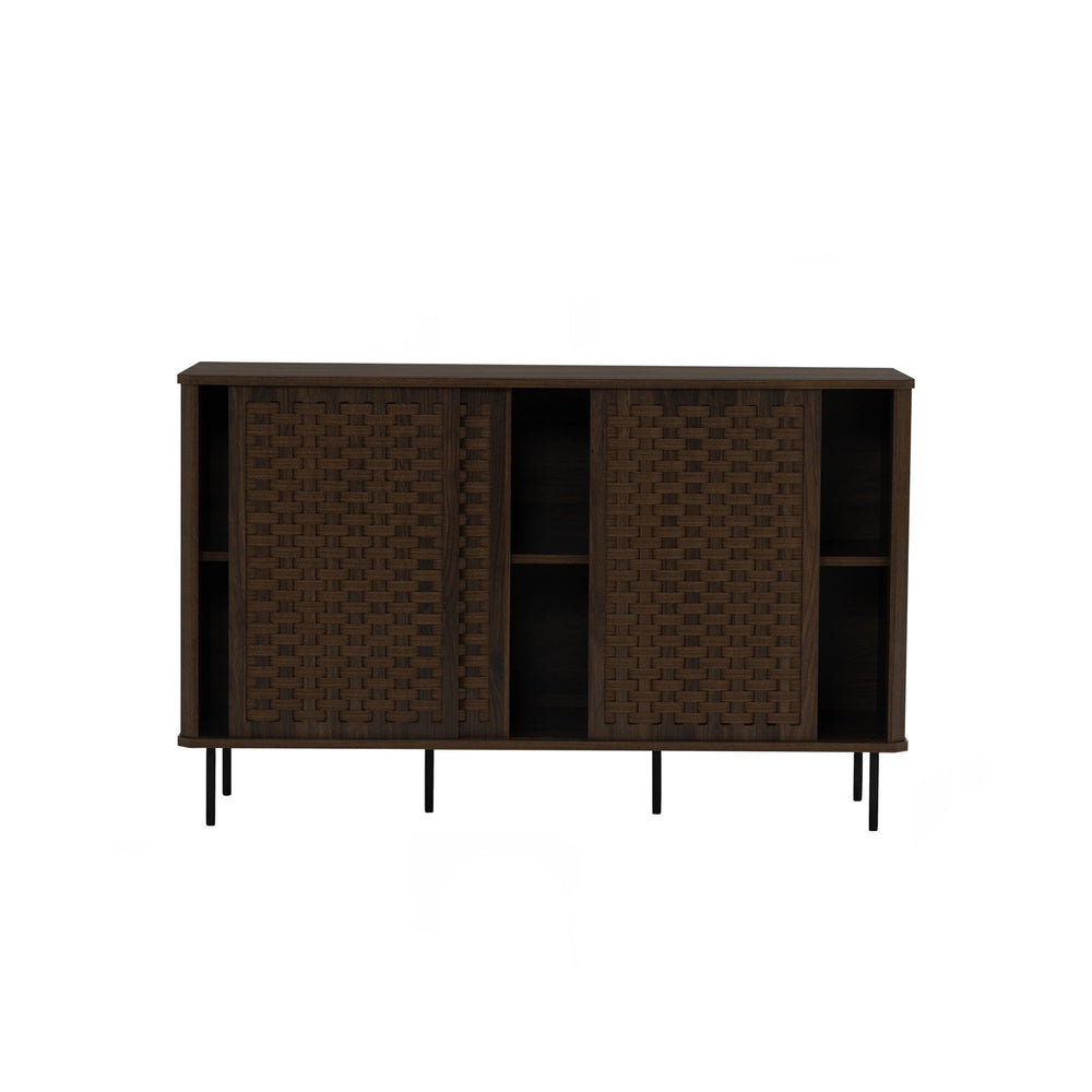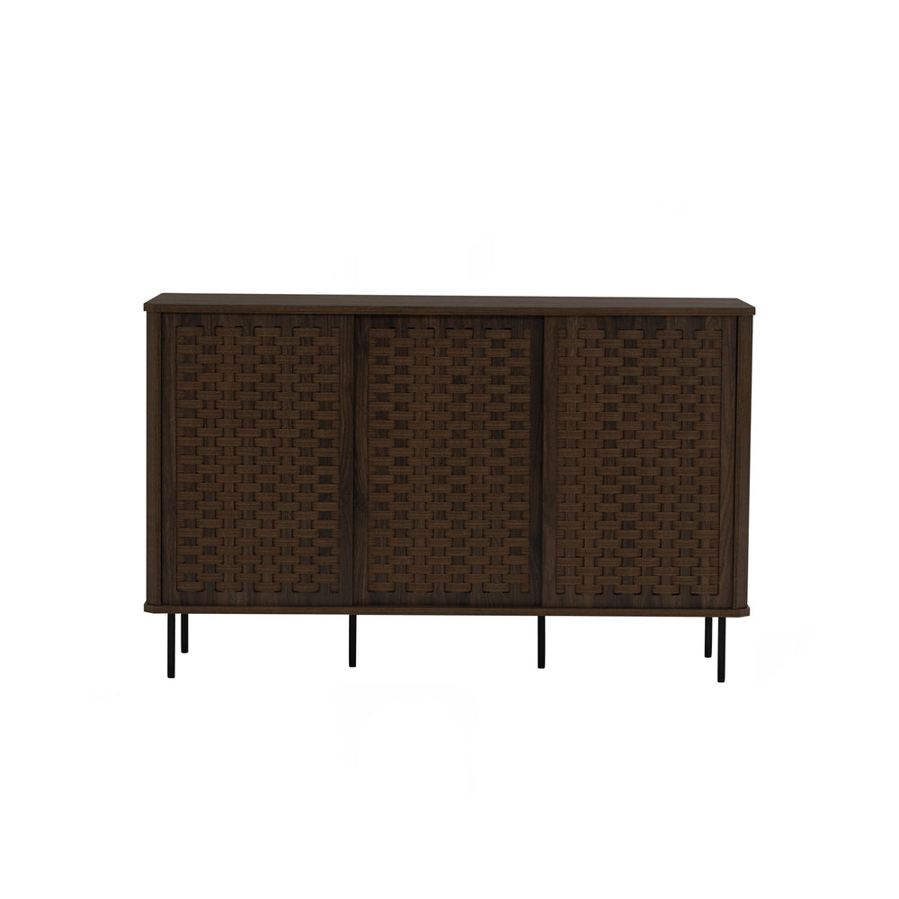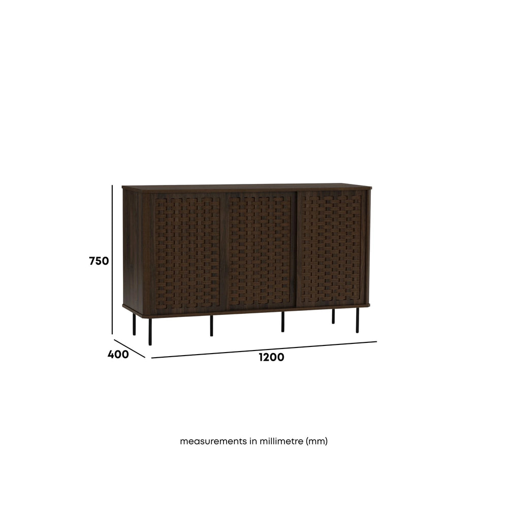 A refined blend of texture and structure, the Breda Sideboard 1.2m brings warmth and character to modern interiors. Crafted in a rich walnut finish, its woven door panels add depth and artisanal detail, while slim metal legs keep the silhouette light and contemporary. Three sliding doors reveal spacious shelving, offering practical storage for dining or living spaces.