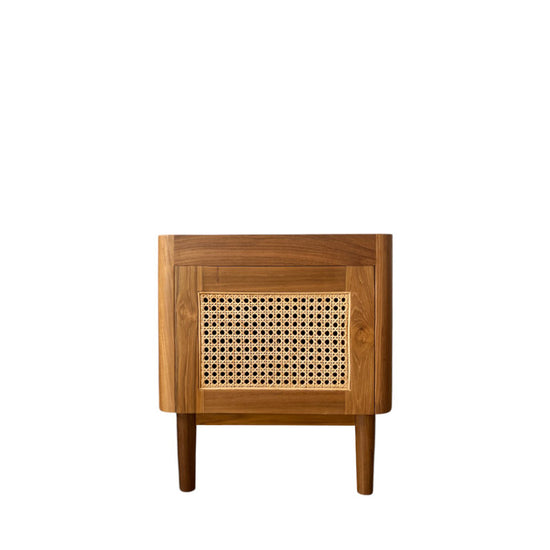 Crafted from solid teak wood and adorned with handwoven rattan, the Bruno Teak Bedside Table embodies timeless charm with a touch of rustic elegance. Its natural finish highlights the rich grain of teak, while the rattan panel adds texture and warmth, creating a harmonious blend of style and practicality.