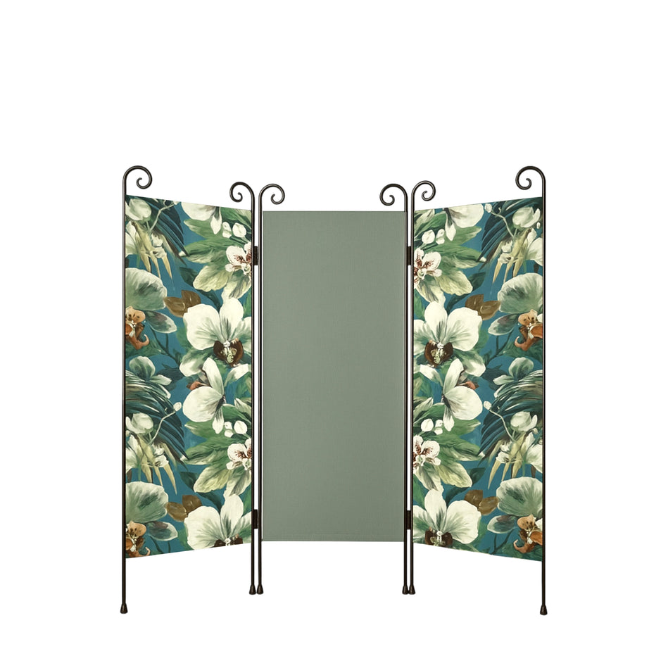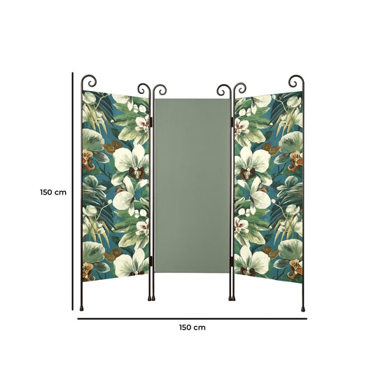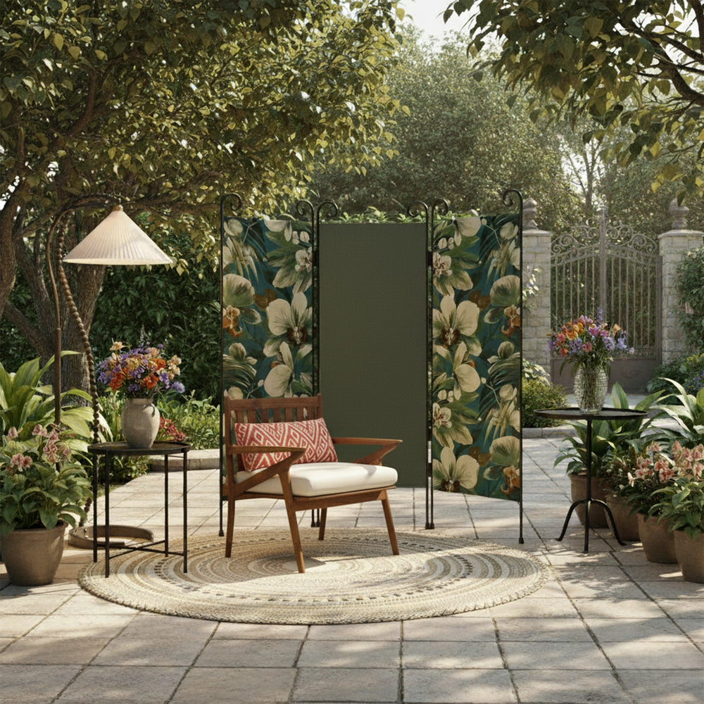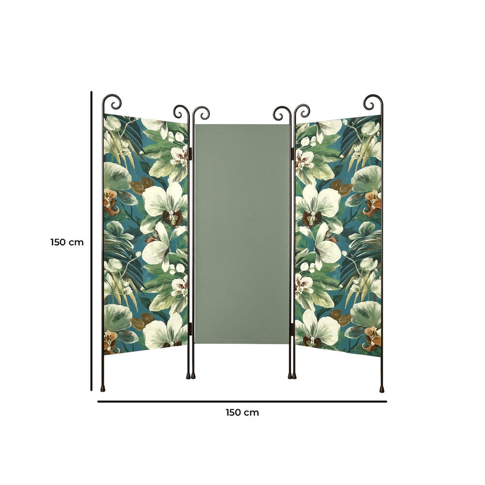 Elevate any space with this handcrafted floral screen. Featuring a sturdy cast iron frame and locally made fabric panels, its tropical blooms bring color and charm. Ideal as a room divider or décor accent, functional art at its finest.