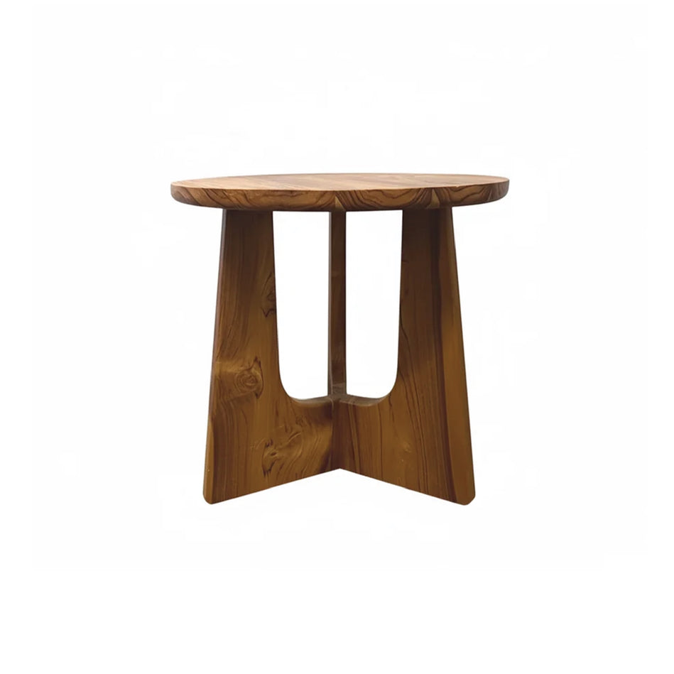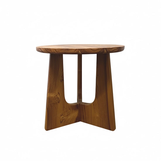 Fermo Teak Side Table features a smooth, round top and a unique base with three converging U-shaped legs, perfect as an elegant companion for your sofa or armchair. Its solid teak construction ensures durability and showcases beautiful natural wood grain.