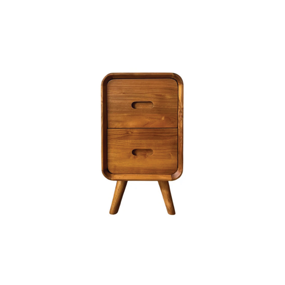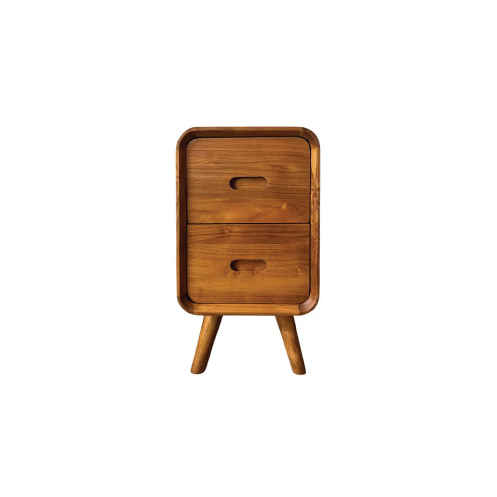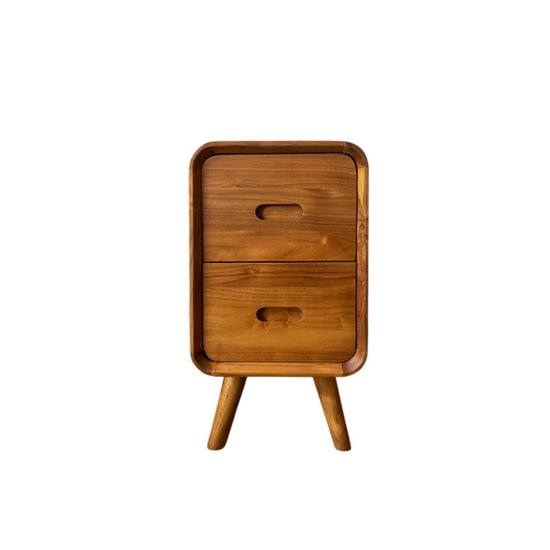 Crafted from solid teak wood, Greta Bedside Table is rich in grain and smooth finish highlight natural beauty. The minimalist design features two manual drawers with sleek cut-out handles, ensuring a clean, hardware-free look.