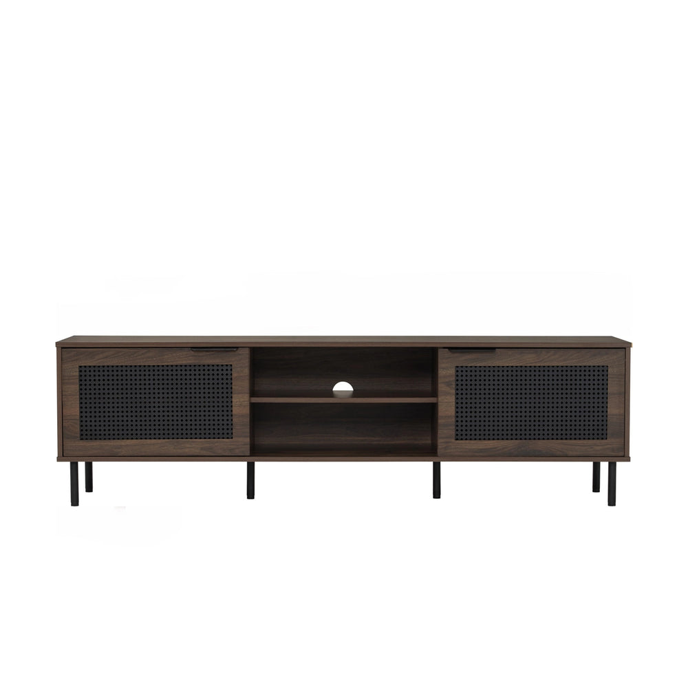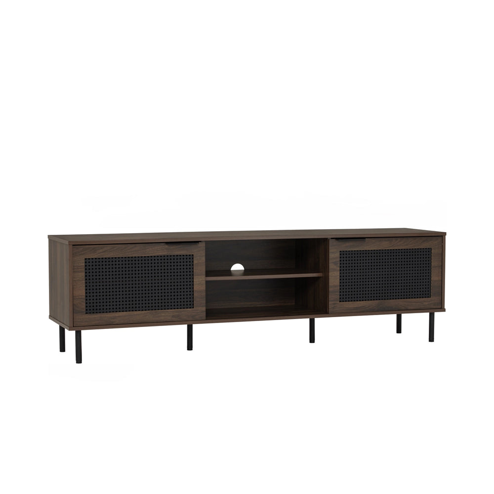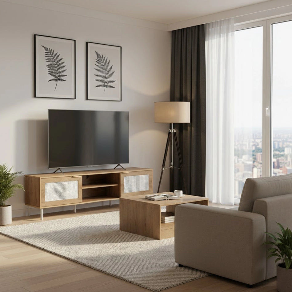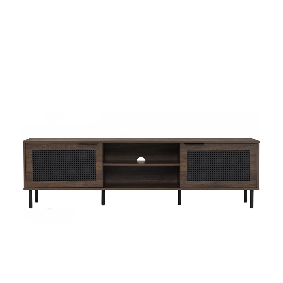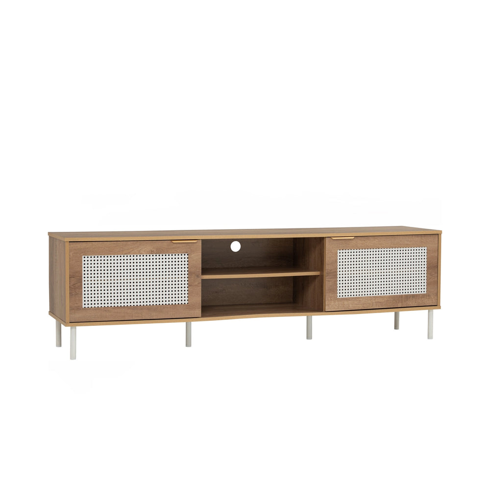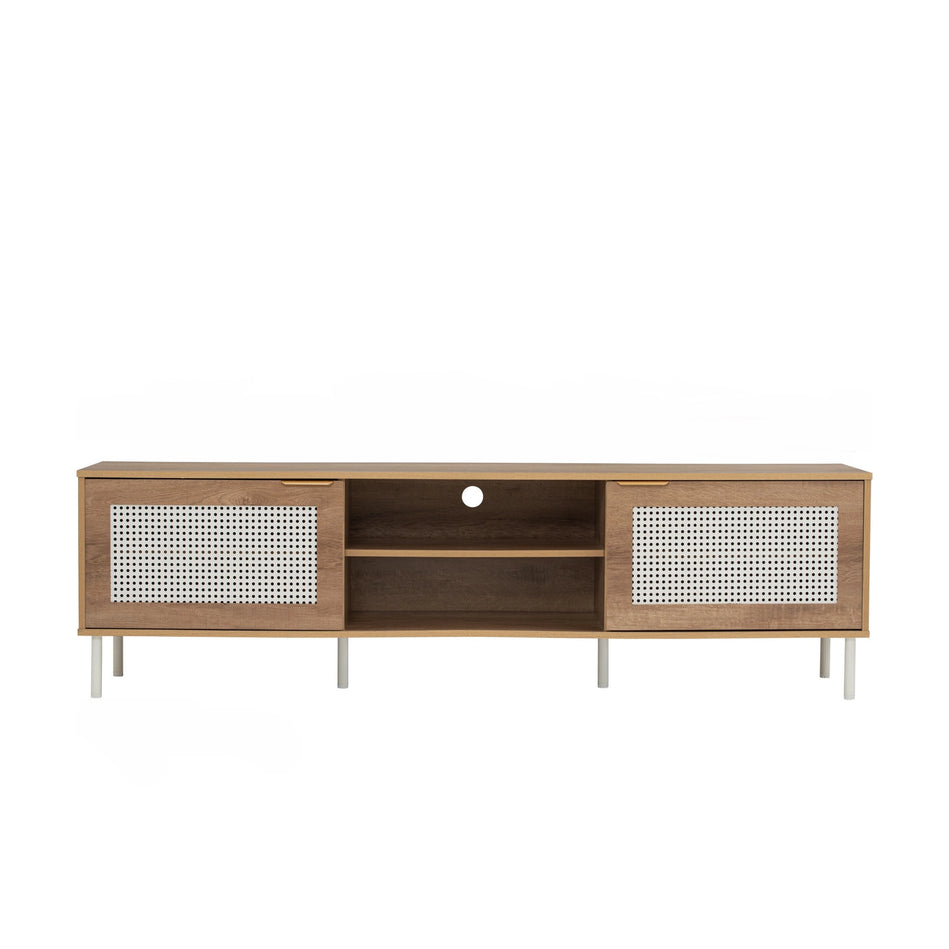 Crafted for modern living, the Hudson TV Cabinet (1.8m) blends mid-century charm with clean functionality. Featuring natural wood tones, perforated rattan-style doors, and sleek metal legs, it offers generous storage with open shelving and cable management. A stylish, space-saving media console for any living room.