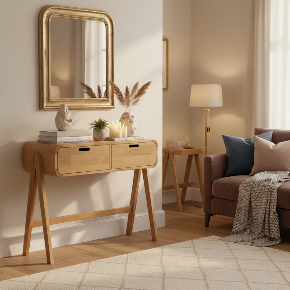 Clean lines meet warm wood in this Iris console table. Crafted from solid Malaysian Oak with rounded edges and dual drawers, it balances form and function effortlessly. Perfect for entryways or living rooms, its minimalist silhouette adds character without clutter. A designer’s go-to for timeless, versatile style.