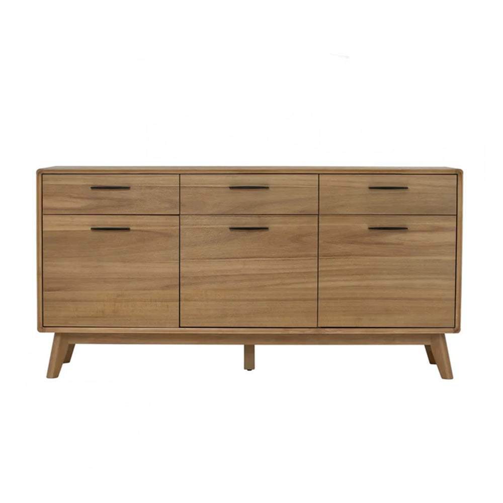 Jana Sideboard 1.6m features 3 drawers and 3 swing doors for balanced form and function. Crafted with a solid oak base and acacia veneer body, it offers warm tones and clean lines.