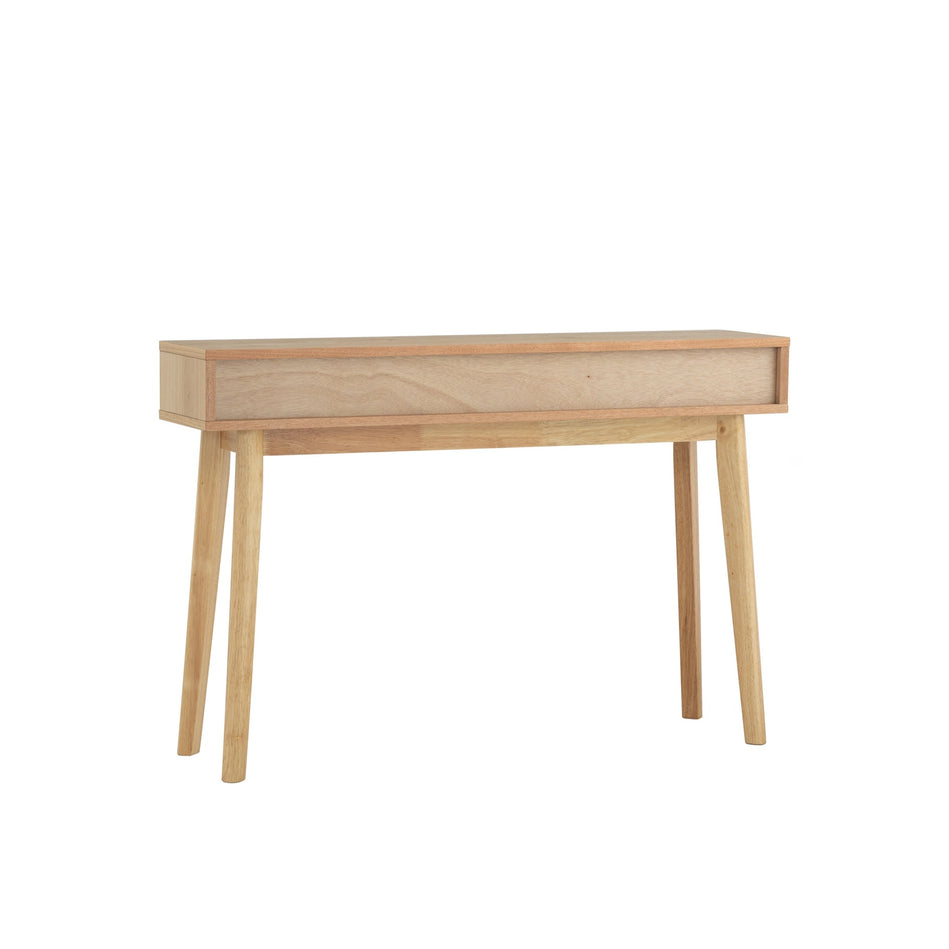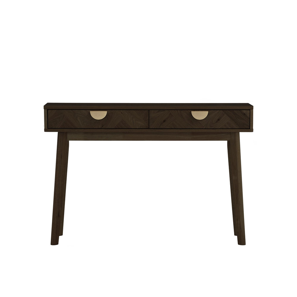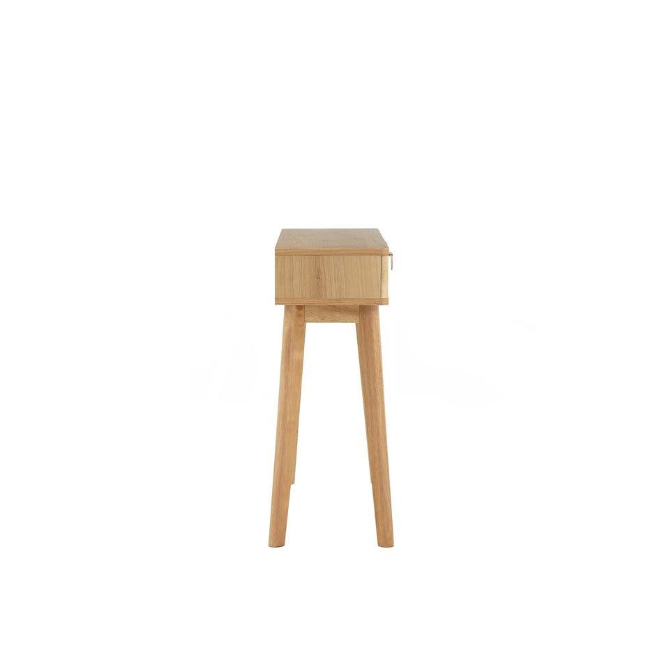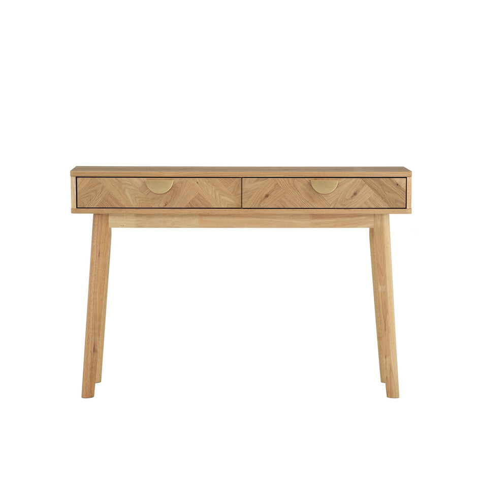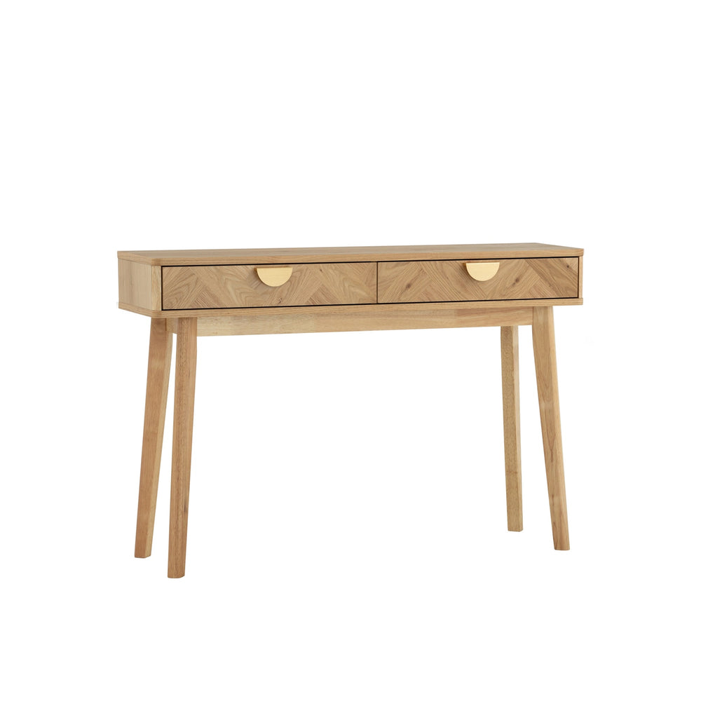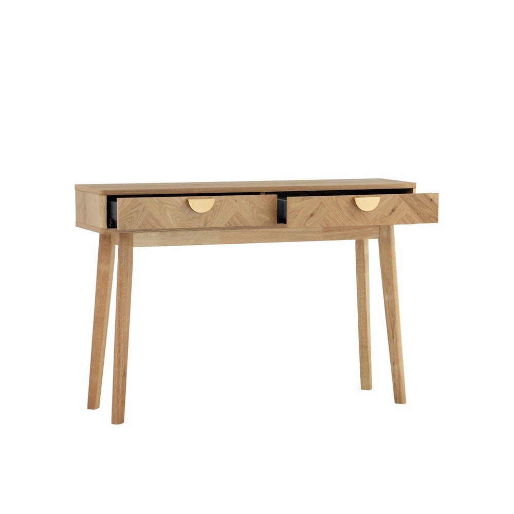 Elevate your space with the Loft Console Table, where mid-century charm meets modern design. Crafted from solid Malaysia Oak Wood with a herringbone Oak Veneer, it features two soft-close drawers and brushed brass half-moon pulls. Sleek, warm, and versatile, perfect for entryways or behind sofas.