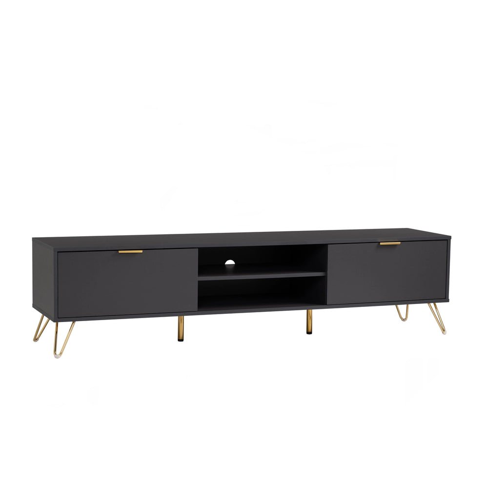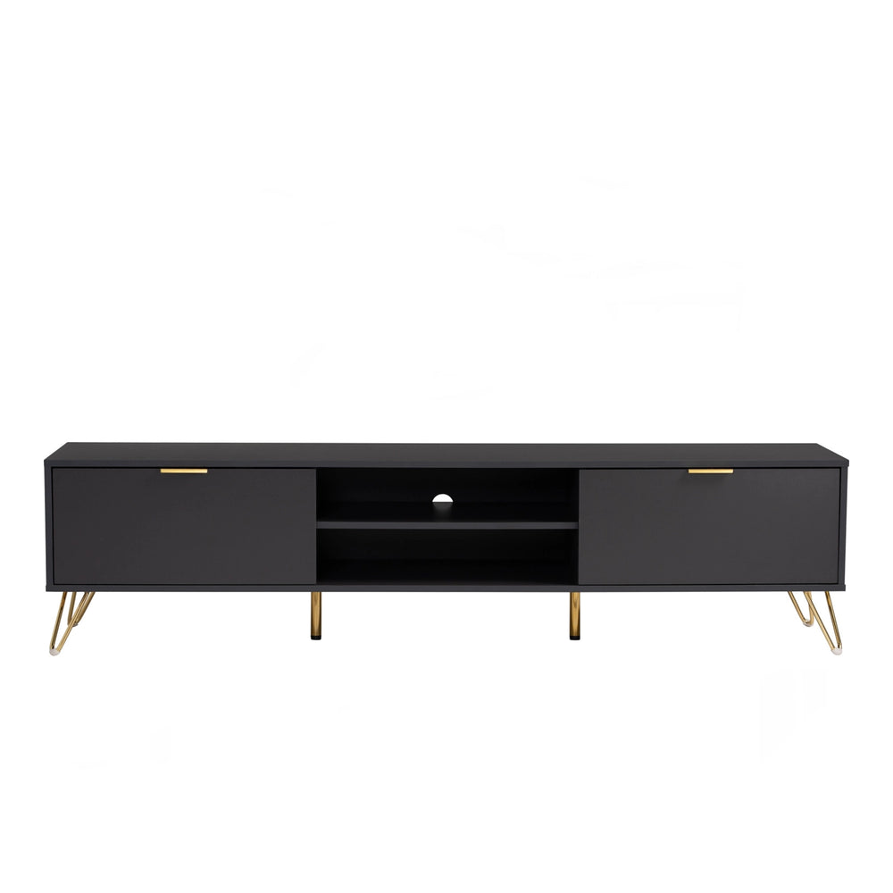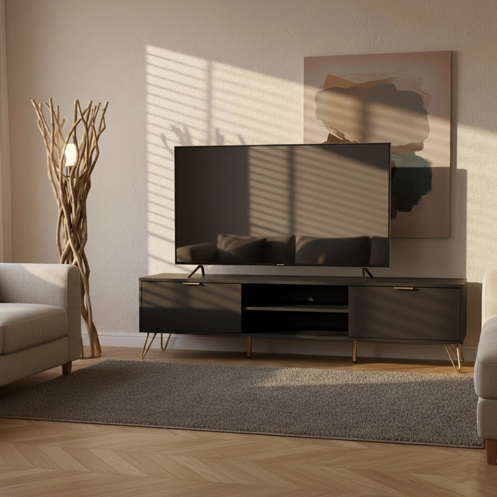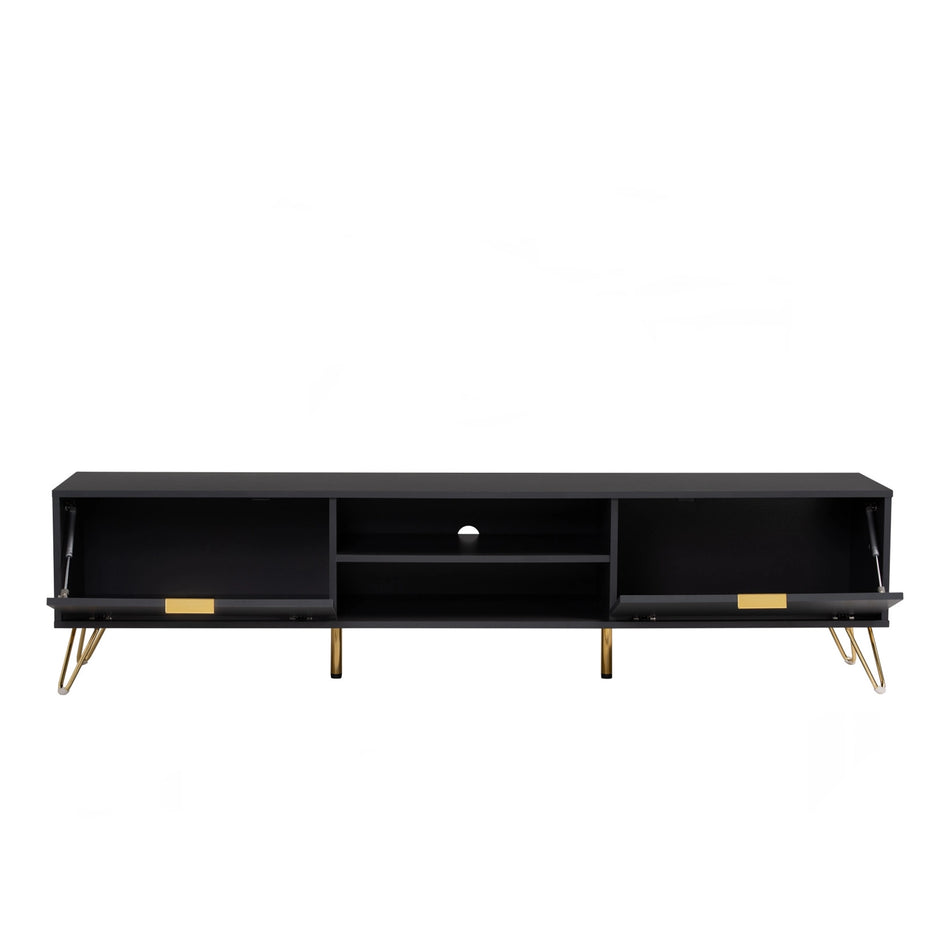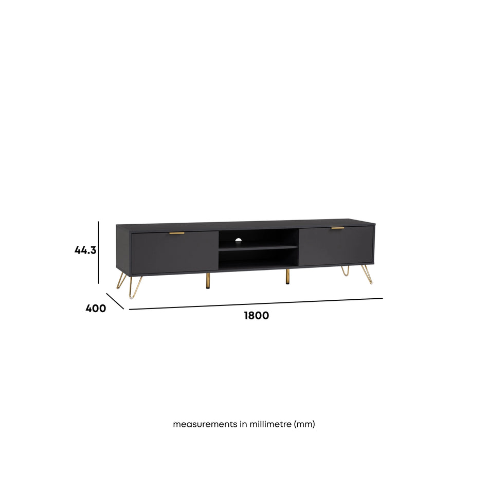 The Luna 1.8m TV Cabinet is a mid-century modern statement piece that brings a luxurious contemporary feel to your home. With its sophisticated matte black finish and striking gold metal legs, this minimalist media console serves as a high-end entertainment center and storage solution. Perfectly sized for large screens, its sleek design elevates any modern living room or home theater with effortless style.