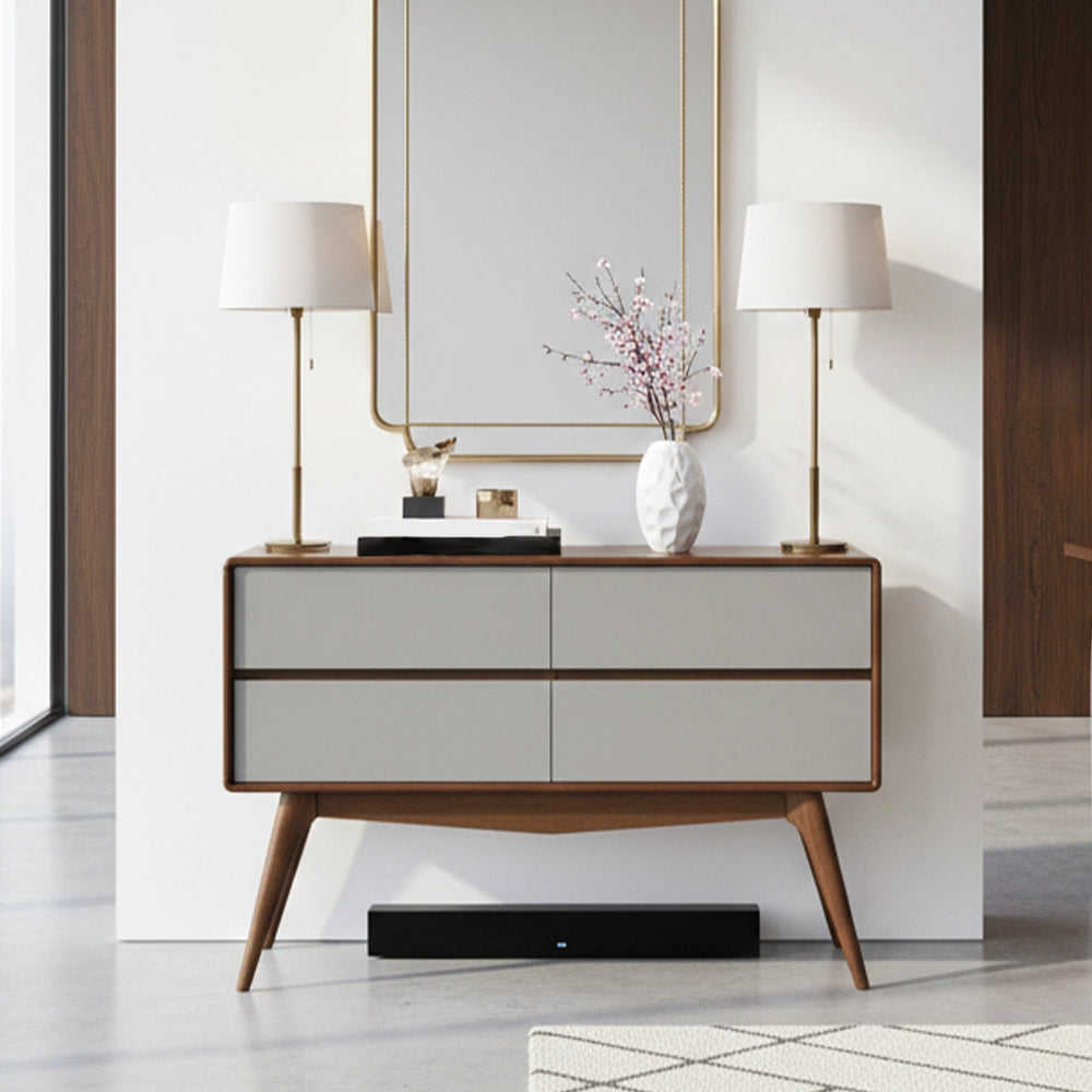 Sleek, sculptural, and smartly crafted, The PhilosConsole Table blends mid-century elegance with modern utility. Featuring four soft-close drawers in matte grey and a walnut-stained oak frame, it brings warm contrast and clean lines to any space. Ideal for entryways or living rooms. A timeless storage statement.