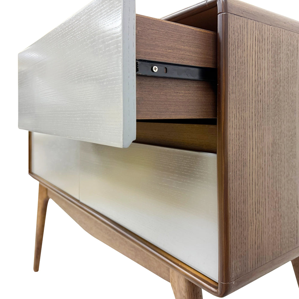 MATERIALS Leg made out of Malaysian Oak Cabinet body made out of MDF and Walnut Veneer. Chamfer edged handle.