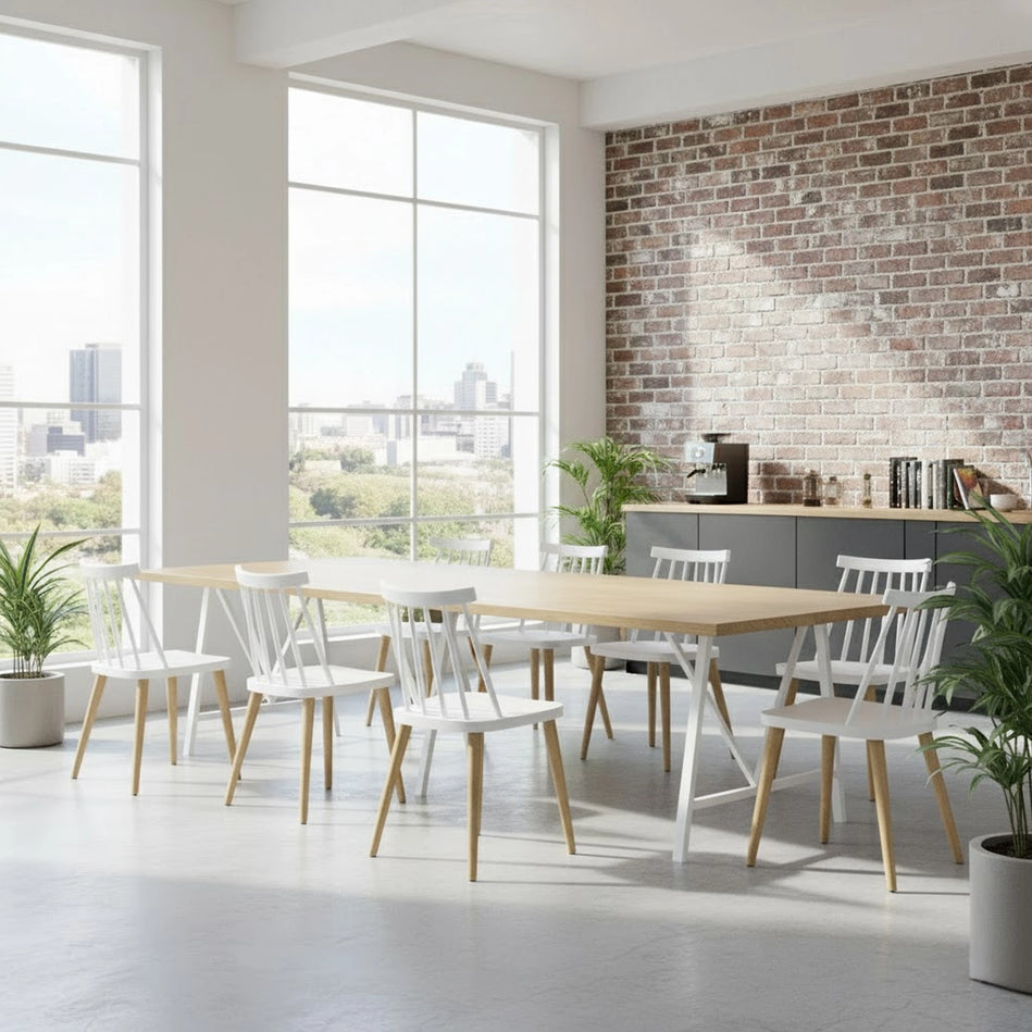 Soren Dining Chair blends Scandinavian minimalism with modern durability. Crafted with a sleek high-quality polypropylene (PP) seat and airy spindle back design, it offers lightweight comfort and easy care.