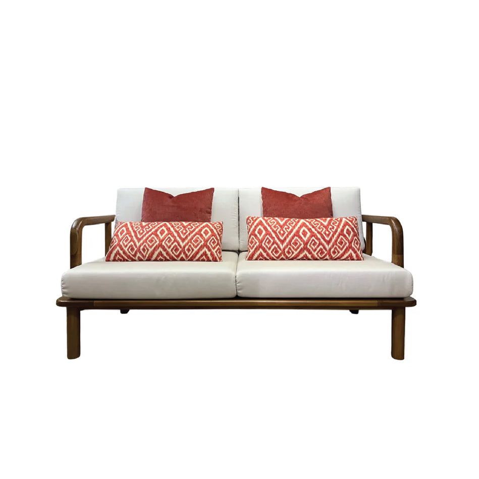 Crafted from solid teak wood, Westin 2-Seater Sofa blends sculptural form with lasting outdoor durability. Its rounded frame and clean lines exude a modern warmth, while plush ivory cushions and rust-toned pillows add bold contrast. A refined yet relaxed piece, perfect for patios, verandas, or indoor-outdoor living.